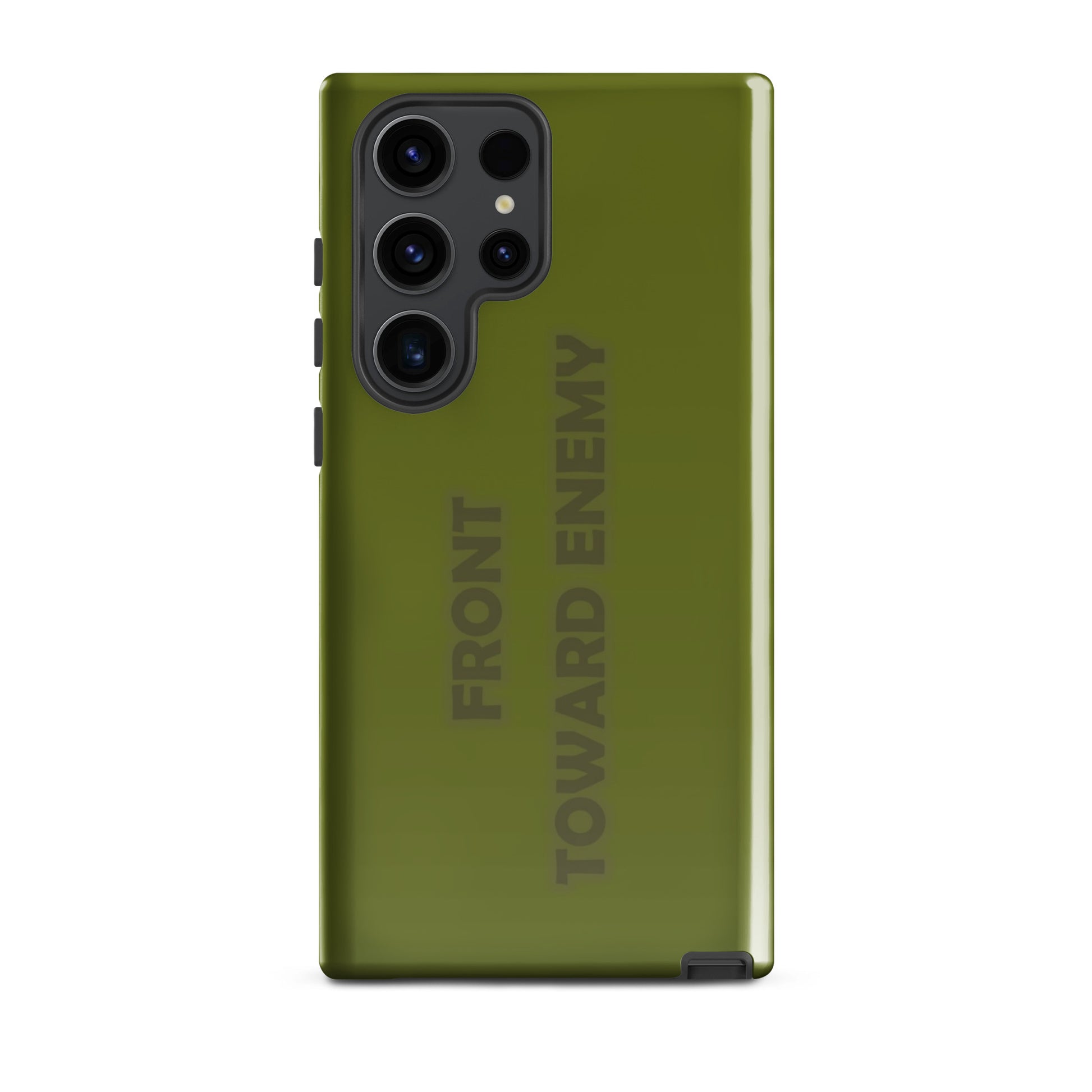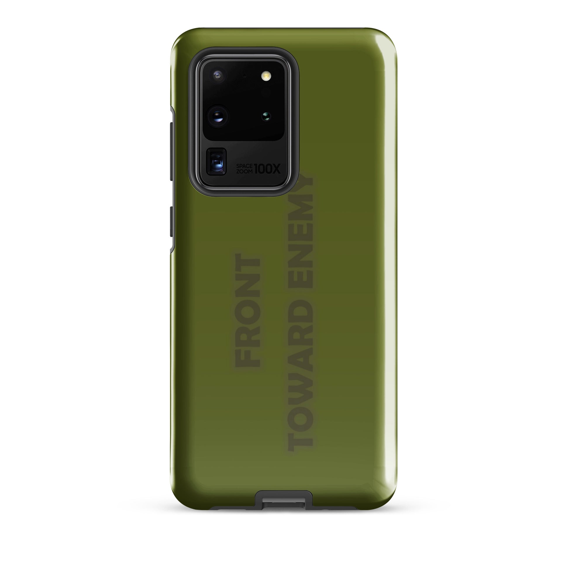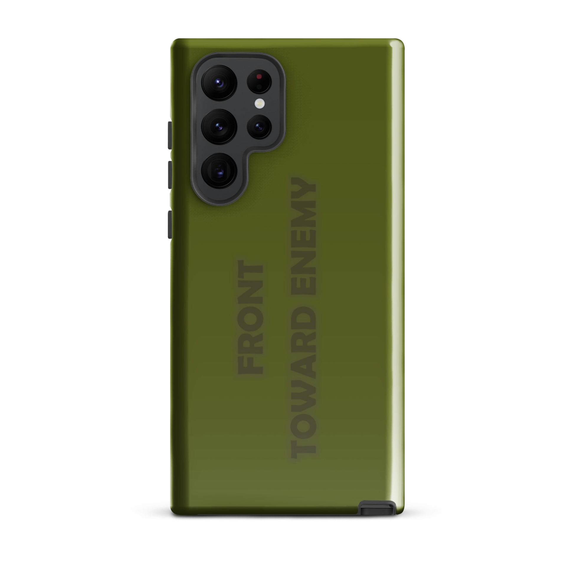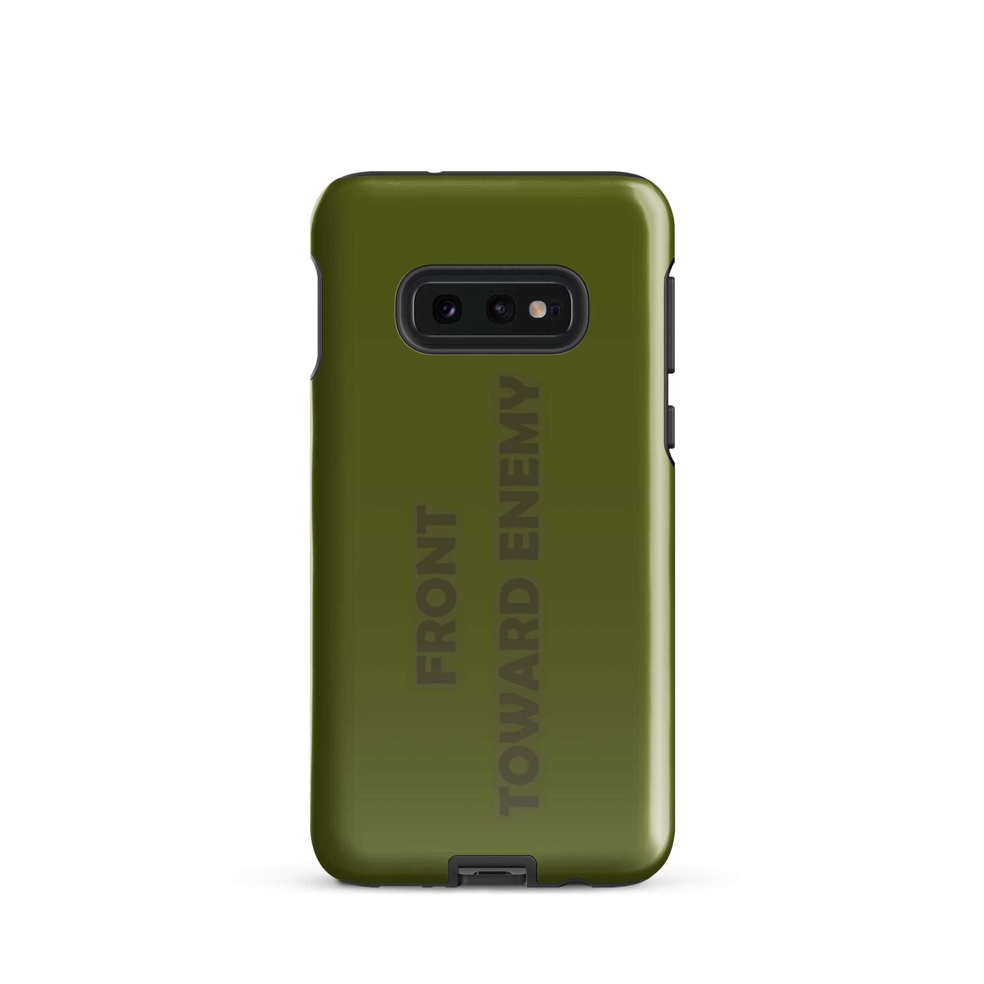 Check out this explosively fun phone case designed to mimic the iconic look of a claymore mine! With the bold text "FRONT TOWARD ENEMY" prominently displayed, it's guaranteed to turn heads and spark conversations. Perfect for military buffs or anyone who loves a good joke, this phone case is sure to protect your phone with a bang! Not only will it shield your device from the bumps and scratches of daily life, but it'll also give your friends a blast every time they see it. Just remember, it's all fun and games until someone asks you to disarm your phone!